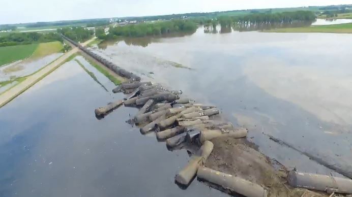 An estimated 230,000 gallons (870,619 liters) of crude oil spilled Saturday into floodwaters of the Little Rock River from 14 of the cars.